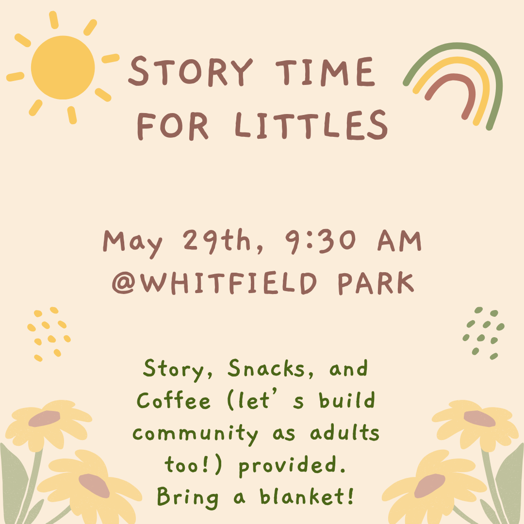 Join us in Whitfield Park for Storytime for Littles! And mark your calendars for the last Friday of each month @ 9:30am (location may vary.)